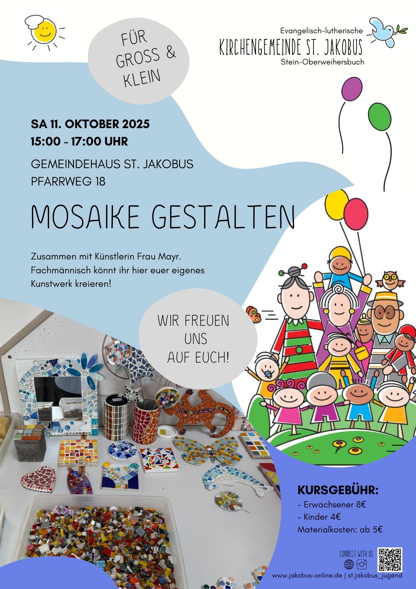 Allgemein Nachmittag Kunterbunt am Samstag 12.10 von 15-17 Uhr – Mosaike Veröffentlicht am 6. Oktober 2025 von Pfrin. Winkler Nachmittag Kunterbunt Pfrin. Winkler Alle Beiträge von Pfrin. Winkler ansehen →