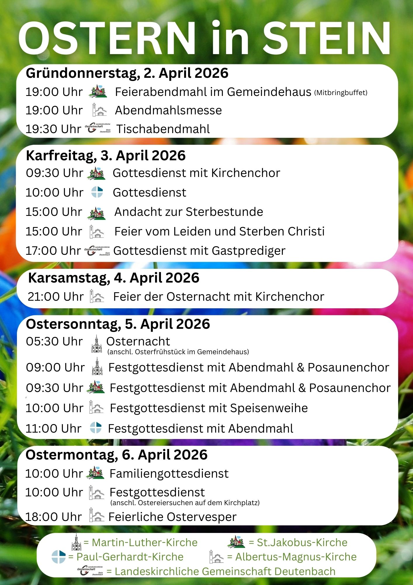 Allgemein Ostern in Stein Veröffentlicht am 1. April 2026 von Pfrin. Winkler 2026, Ostern in Stein Pfrin. Winkler Alle Beiträge von Pfrin. Winkler ansehen →